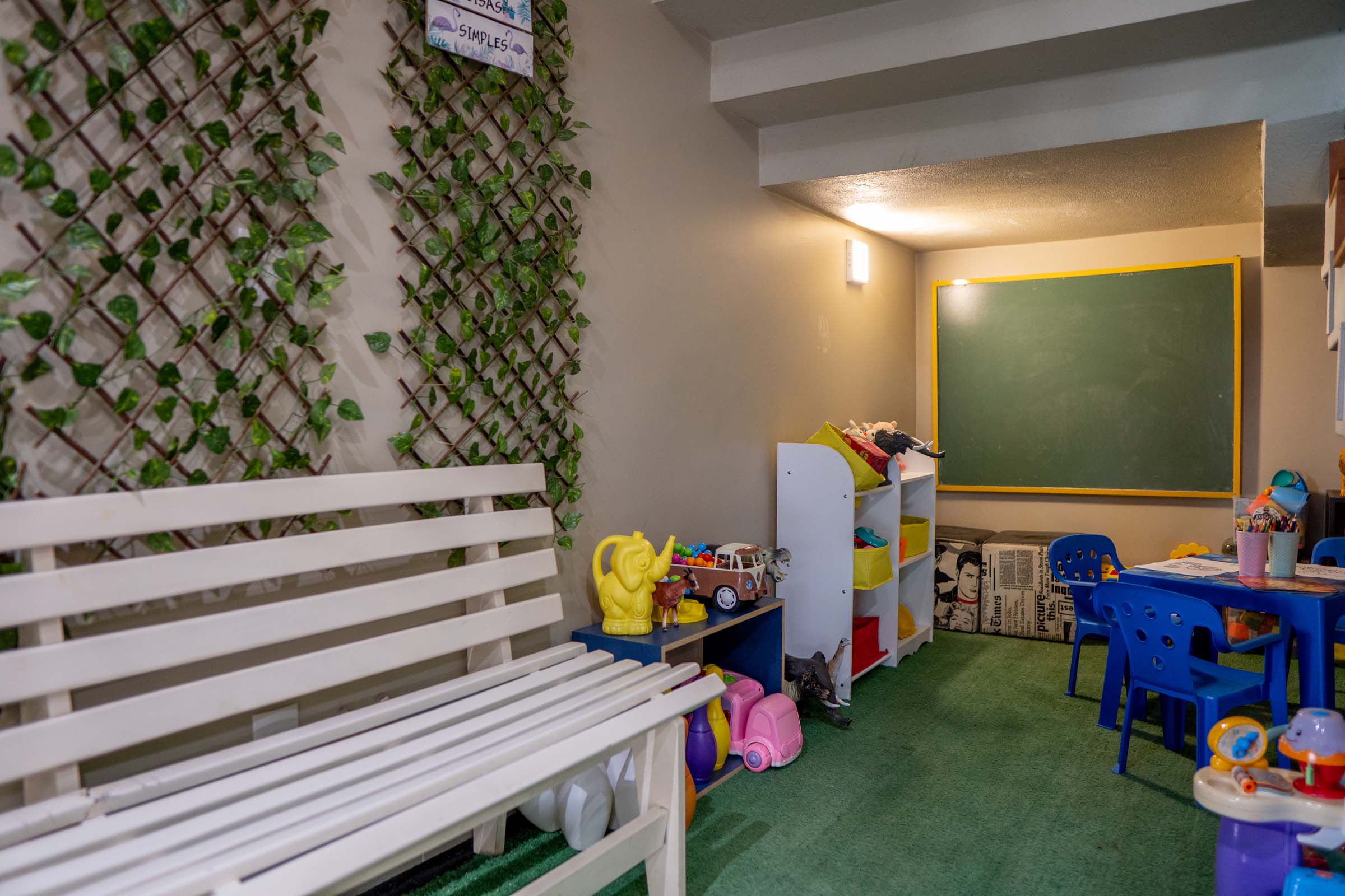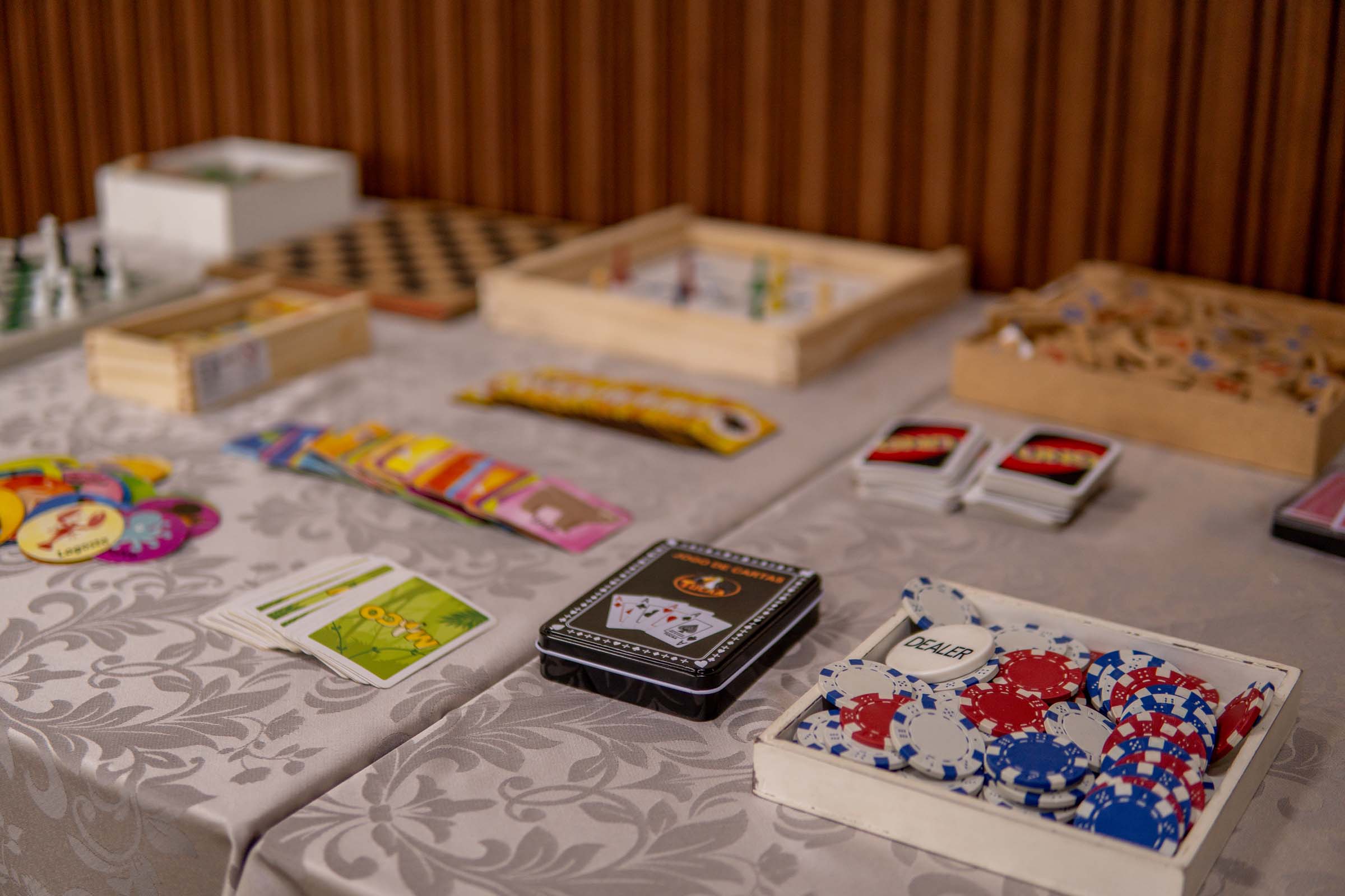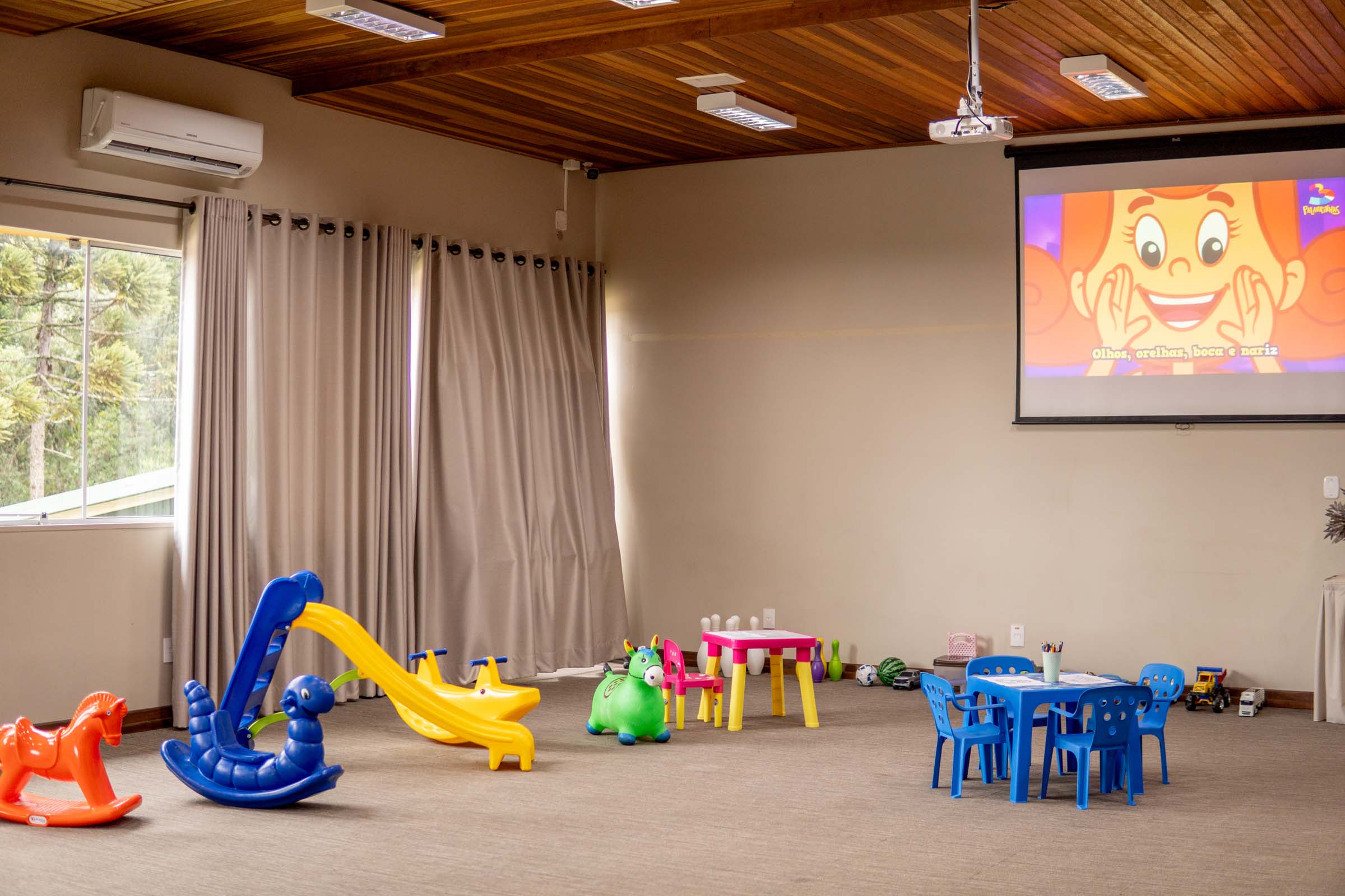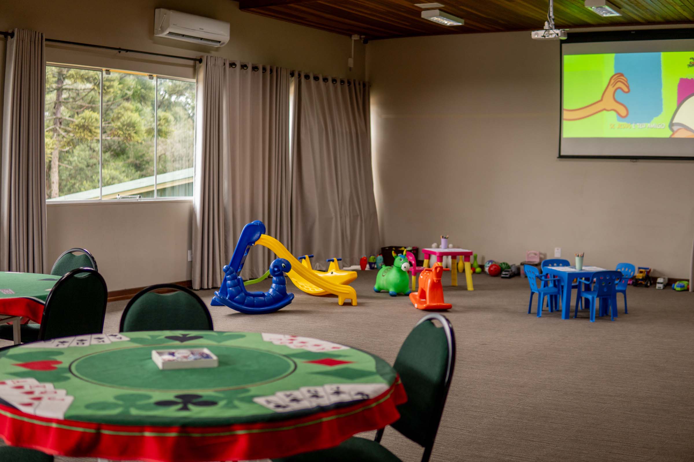 Nos dias de semana contamos com um pequeno espaço para a criançada. Aos finais de semana, uma sala mais ampla é montada com brinquedos, telão e mesas para jogos de cartas e tabuleiros.